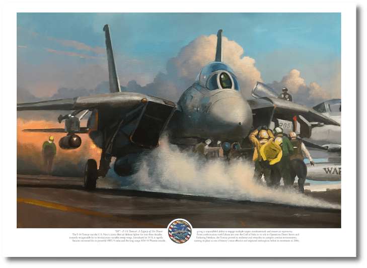 Capture the raw power and sweeping lines of the legendary F-14 Tomcat with the exquisite fine art print, "60". This stunning piece immortalizes the fighter jet at the peak of its glory, featuring the intense action and dramatic atmosphere of carrier deck operations. Rendered with striking detail and rich, oil-painting texture, "60" is more than just a picture; it is a celebration of naval aviation and speed, ready to become the centerpiece for any enthusiast's collection. Secure your limited-edition print today and bring the iconic spirit of the Tomcat into your home or office.