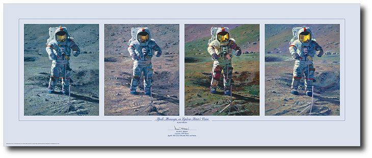 Apollo Moonscape, An Explorer Artist’s Vision a Pop Art feel while presenting a wonderfully graphic example of the artist’s visual journey. You have your choice of either a fine art canvas or paper giclèe of the work, each signed by Apollo 12 astronaut, moonwalker and explorer Alan Bean. Own your own piece of art history, the first paintings of another world by an artist who was actually there!