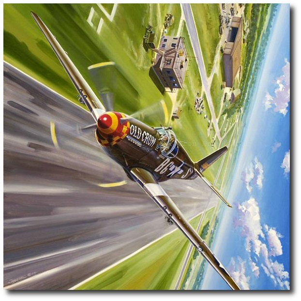 Captain C. E. "Bud" Anderson executes a right turn after a low pass down runway 36 to enter the pattern for runway 13 at Leiston Air Base in England. The scene depicted depicts Captain Anderson's P-51B-15NA "Old Crow" as it would have looked just a couple of days before D-Day, 6 June 1944.
