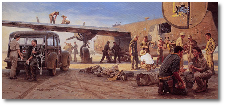 The exhausted crew of the B-24, Utah Man, has returned to base near Benghazi, Libya, on August 1, 1943, after bombing the great oil refineries around Ploesti- a mission of more than thirteen hours in the air. The pilot, 1st Lt. Walter T. Stewart, is describing his mission experience to Major Ramsay D. Potts, who had returned earlier that day.