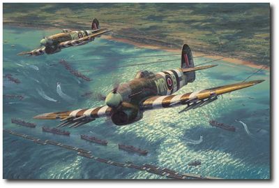 Throughout the early morning of 6 June 1944, men of the US 29th Infantry Division had fought their way yard by yard across the bloody shingle of Omaha Beach, but the strong German opposition was unexpected. It was the same on most sectors of ‘bloody Omaha’ beach that morning. Showing unparalleled levels of bravery and determination, the US infantrymen finally prevailed and within days the scene on the beach was a hive of activity as ‘Mulberry A’ - one of two giant artificial harbours that had been towed across the Channel – was erected off this once-deadly beach. Anthony Saunders’ intensely graphic new painting depicts a pair of RAF Typhoons from 245 Sqn over the American Mulberry. They race back to their base in Hampshire to re-fuel and re-arm after delivering a blistering rocket attack on German positions behind the everwidening Normandy beachhead.