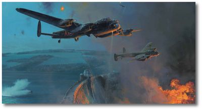 Within seconds of successfully releasing their Upkeep bouncing bomb, “Dinghy” Young and the crew of AJ-A ‘Apple’ are hurtling over the damaged fortress-like wall of the Möhne dam. Commanding Officer Guy Gibson flying alongside noted that Young’s bomb made ‘three good bounces’ before striking the dam wall.