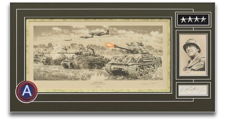 Also included alongside in the matting is a completely separate portrait of Patton, a museum-quality reproduction four-star General lapel pin and U.S. Third Army cloth shoulder patch, plus the ORIGINAL autograph of the legendary leader himself.