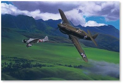 2nd Lt. Kenneth M. Taylor was one of the first U.S. pilots to see action in World War II. He destroyed four enemy aircraft on the "date which will live in infamy," December 7, 1941 at Pearl Harbor - wearing a pair of tuxedo pants and a uniform shirt he scrambled into after going to a dance and playing poker the previous night. "I painted him in his P-40B alongside a Japanese Val that was part of Lt. Commander Zenji Abe's attack force, against the lush Hawaiian hillside."