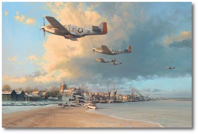 Flying low over the snow covered village of Maldon in Essex, Major Robin Olds, in his P-51K Scat VI, leads a flight of Mustangs of the 434th Fighter Squadron, 479th Fighter Group back to their base at Wattisham, on 14 February 1945. During their long range escort mission Olds had added three more German fighters to his tally over Berlin, making him one of the foremost Aces in the Eighth Air Force.